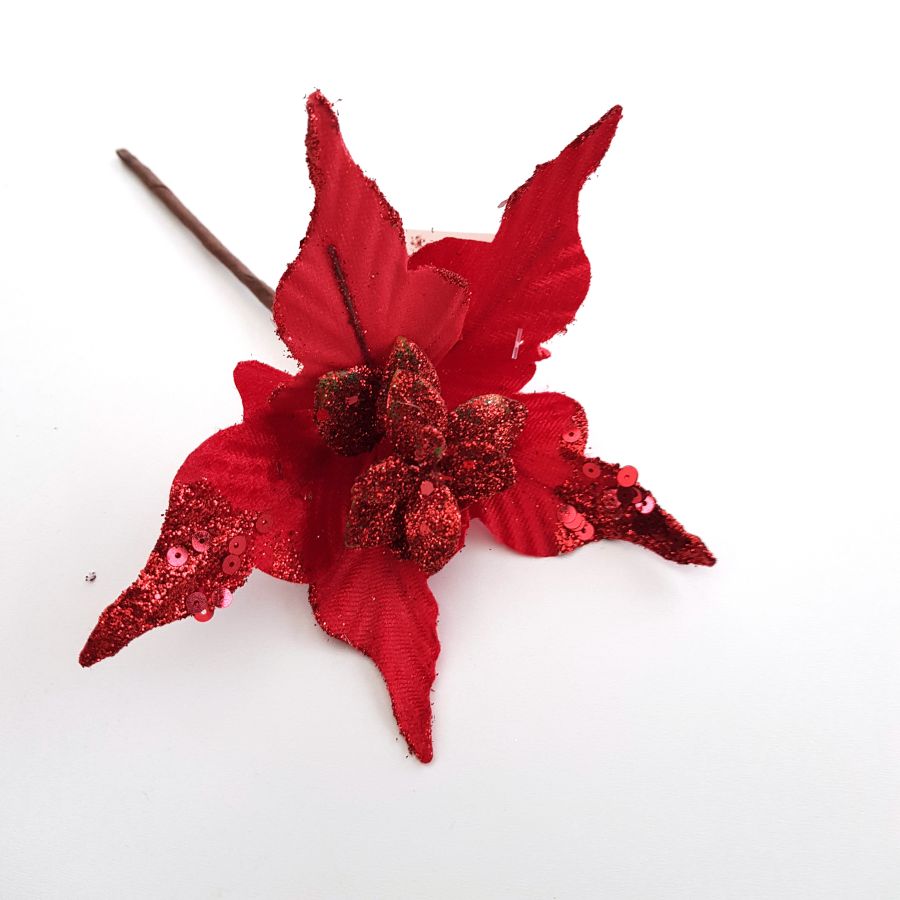 Dekorační květ červený se třpytkama 15cm
