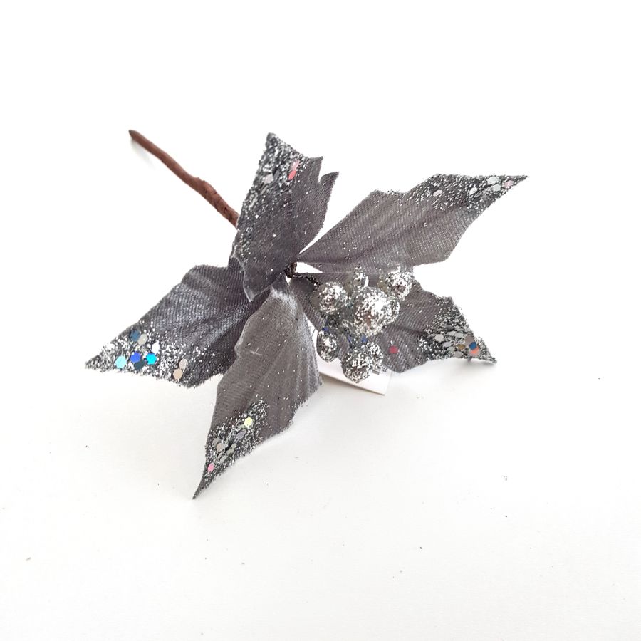 Dekorační květ stříbrný se třpytkama 10cm