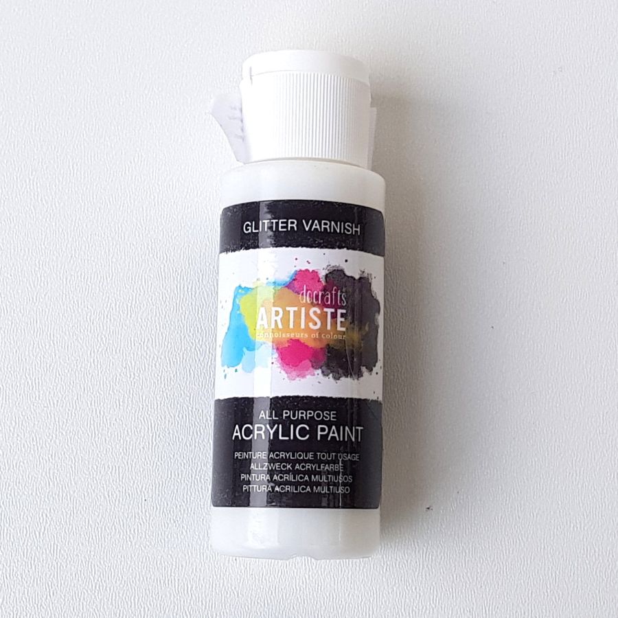 na již suché barvy Artiste pro třpytivý efekt na povrchu. Lak je na vodní bázi, čištění štětců vodou. Suché na dotek během jedné hodiny. Při skladování nevystavujte slunci ani extrémním teplotám. Nevhodné pro děti do 3 let.