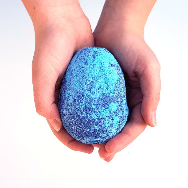 Voňavá, barevná bomba do koupele z koupelové soli a bambuckého másla. Připomíná dračí vejce.