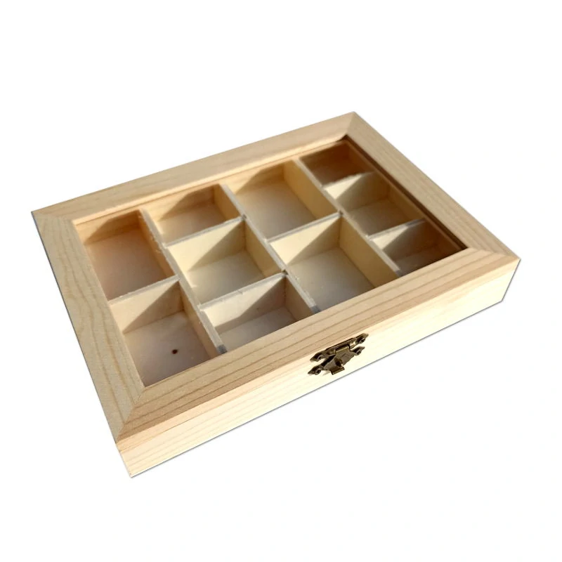 Krabička z přírodního dřeva se skleněným průhledem.