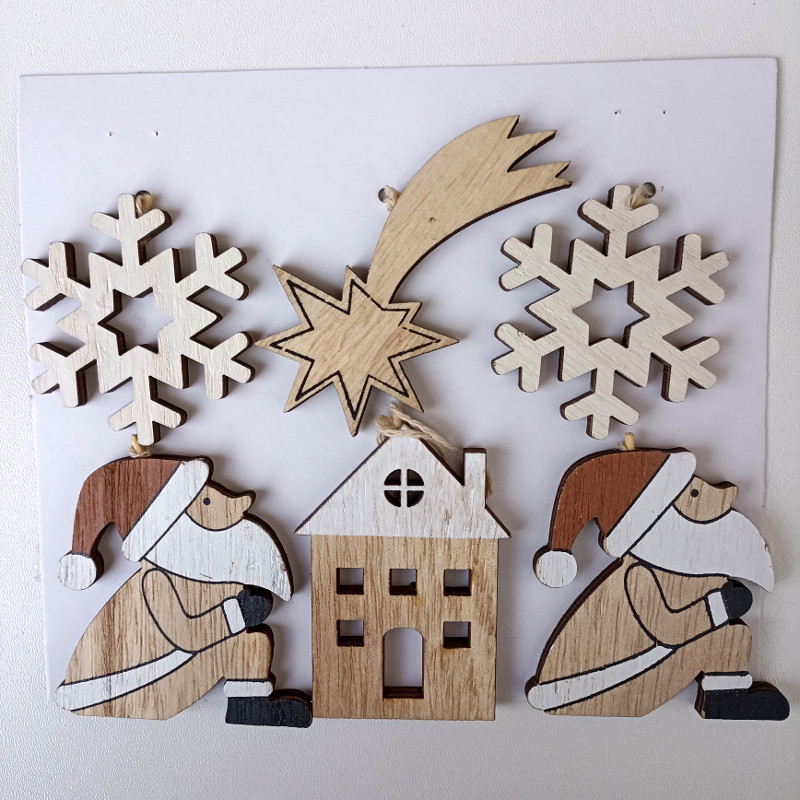 V balení 6ks( 2 postavy, 2 vločky, kometa a domeček)
